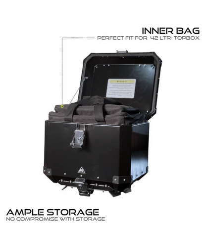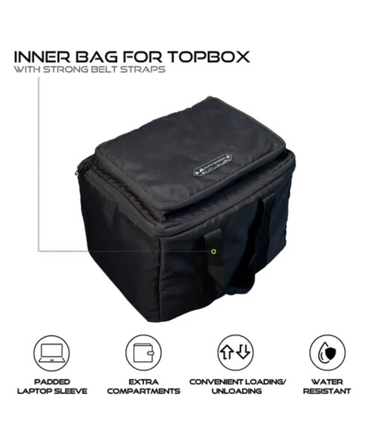 - Elevate your travel organisation with our Top Box Inner Bag, featuring 42 litres of storage, a padded laptop sleeve, extra compartments, strong belt straps, and easy loading and unloading for hassle-free journeys.