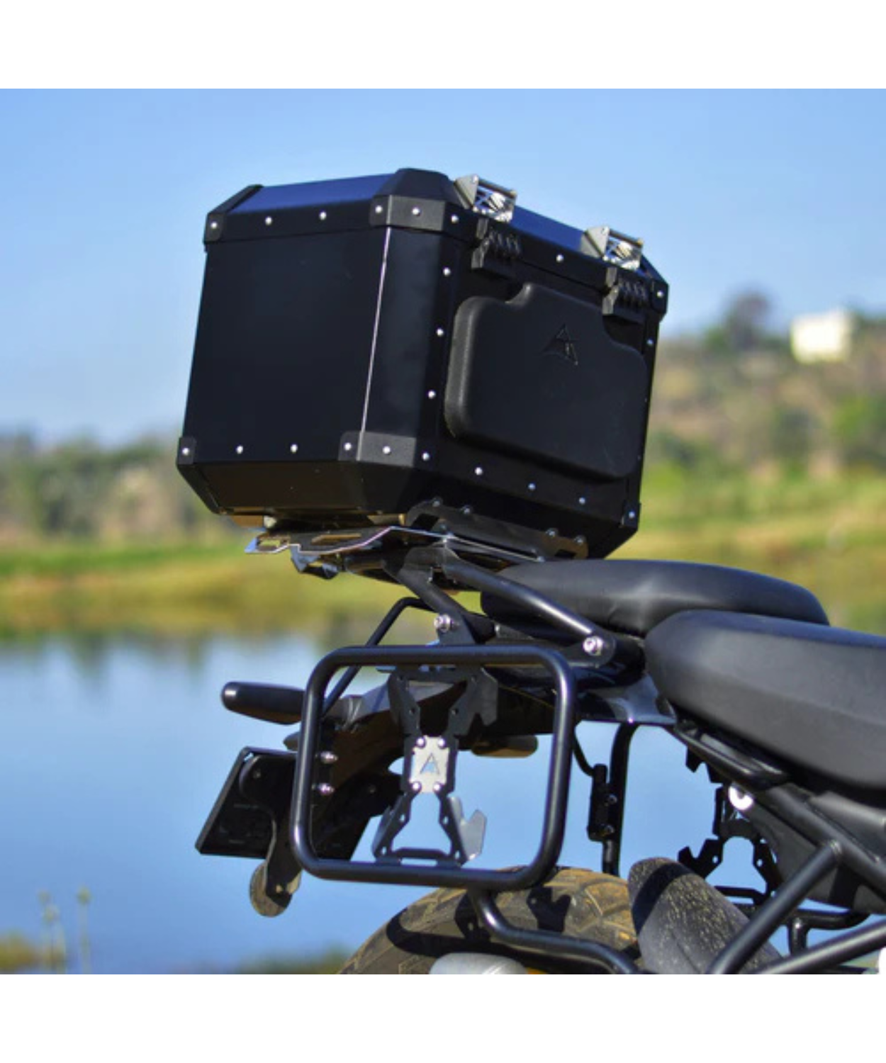 - The top case elements are designed with an industrial theme that gives them a rugged appearance, making them ideal for adventure motorcycles.