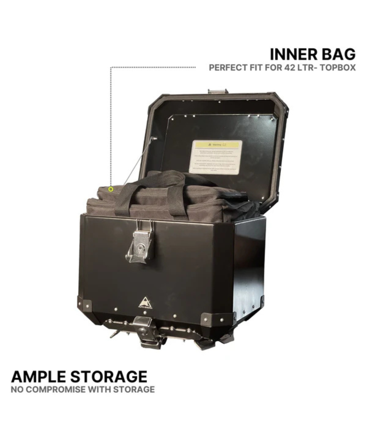 Elevate your travel organisation with our Top Box Inner Bag, featuring 42 litres of storage, a padded laptop sleeve, extra compartments, strong belt straps, and easy loading and unloading for hassle-free journeys.