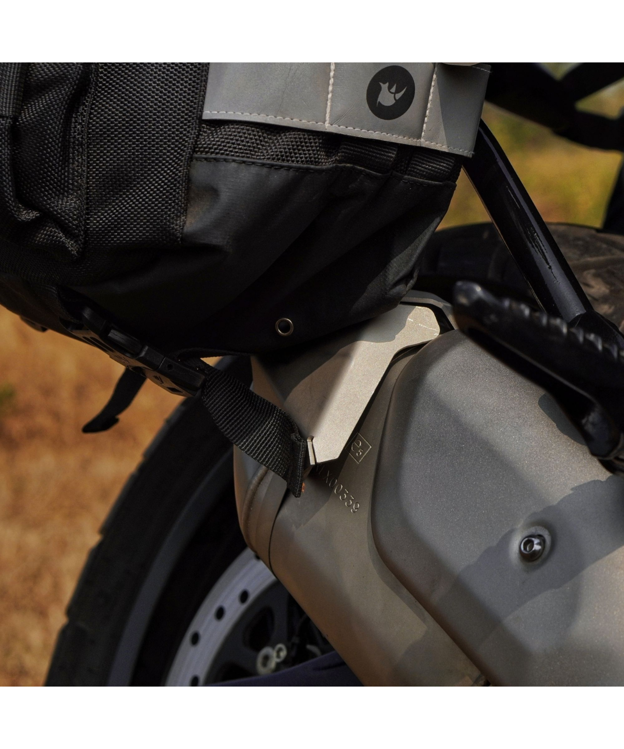 Functionality: This heat shield extender is designed to prevent exhaust heat from reaching your soft luggage. By extending the coverage of the stock exhaust shield, it reduces the risk of burns or damage to your saddle bags from direct heat or fumes. The extender increases the surface area of the exhaust shield without affecting airflow or the bike's heat dissipation, maintaining optimal performance while protecting your gear on long rides or during challenging terrain.