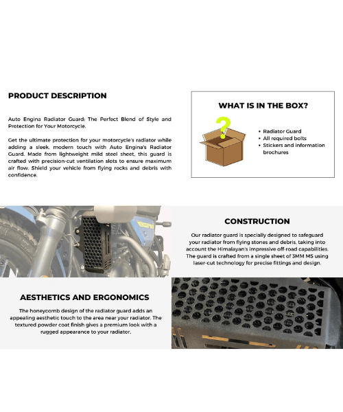 - Our radiator guard is specially designed to safeguard your radiator from flying stones and debris, taking into account the Himalayan's impressive off-road capabilities.