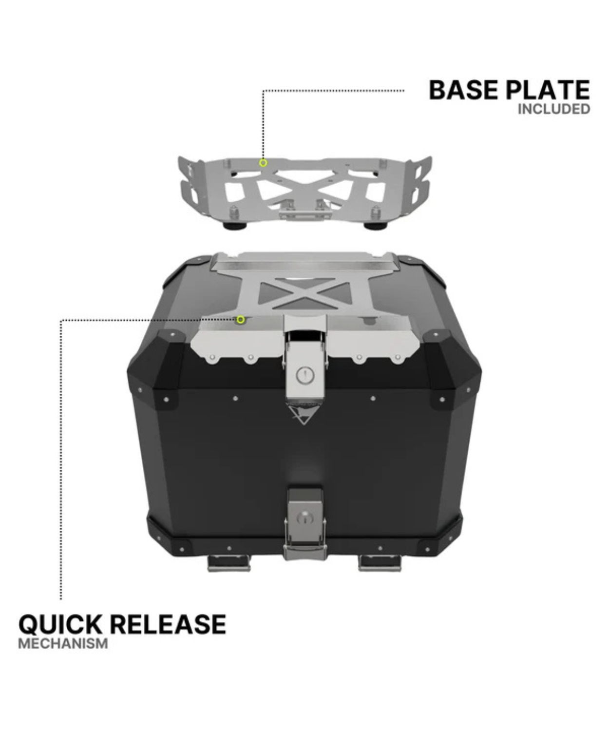 Quick Release Mechanised: Top case is mechanised with quick release feature allows easy removal and attachment of box. Mechanism consist of quick release bracket, 3mm SS base plate and quick release lock.