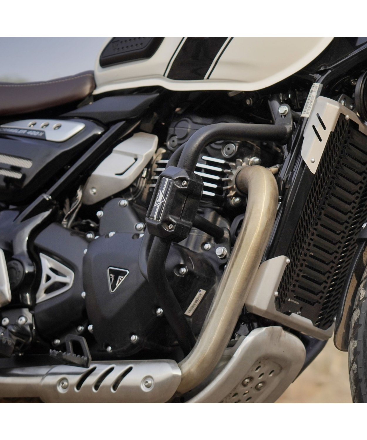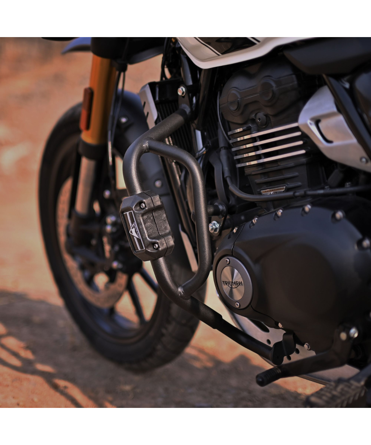 - Protect your Triumph Scrambler 400X with Auto Engina’s Crash/Leg Guard – a robust safety solution featuring a 3-point mounting system and built-in sliders for maximum defense.