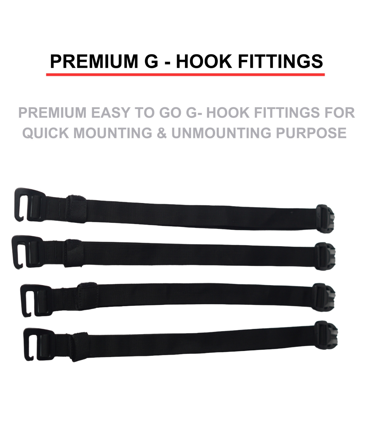 - 4 qucik release mounting straps (2 front, 2 rear) with easy to use g-hooks.