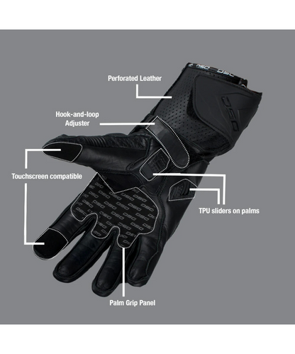 - Crafted from perforated leather, the RacePro Sport ensures optimal airflow, keeping hands cool and comfortable even under intense riding conditions.