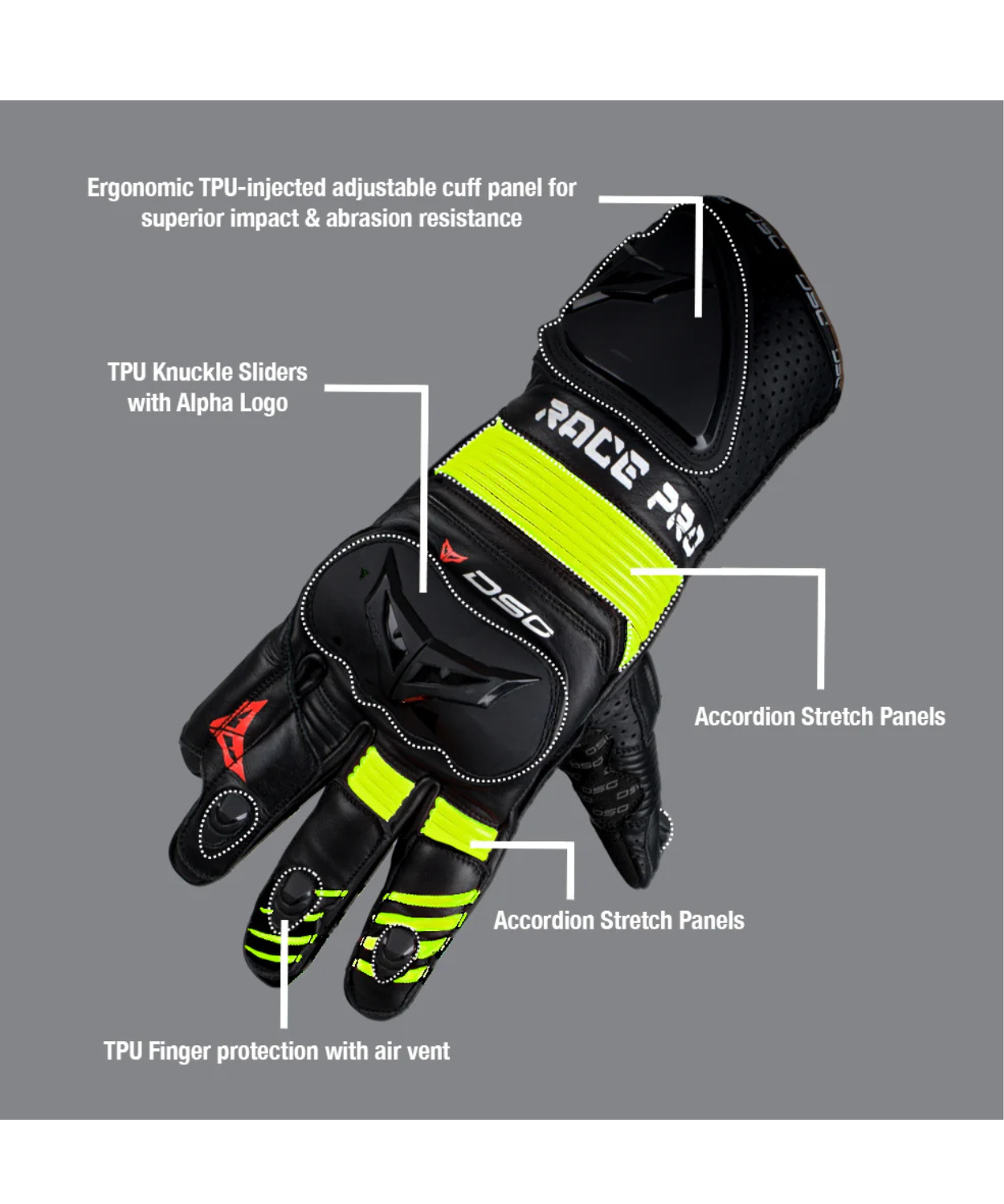 - The DSG RacePro Sport Glove is India’s first and only track-ready glove, built to deliver high performance, premium protection, and unparalleled comfort.