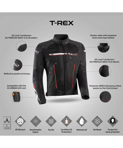Protections: flexible and breathable CE Level 1 protections (IX-PROFLEX SEKA-1) at shoulders and elbows.