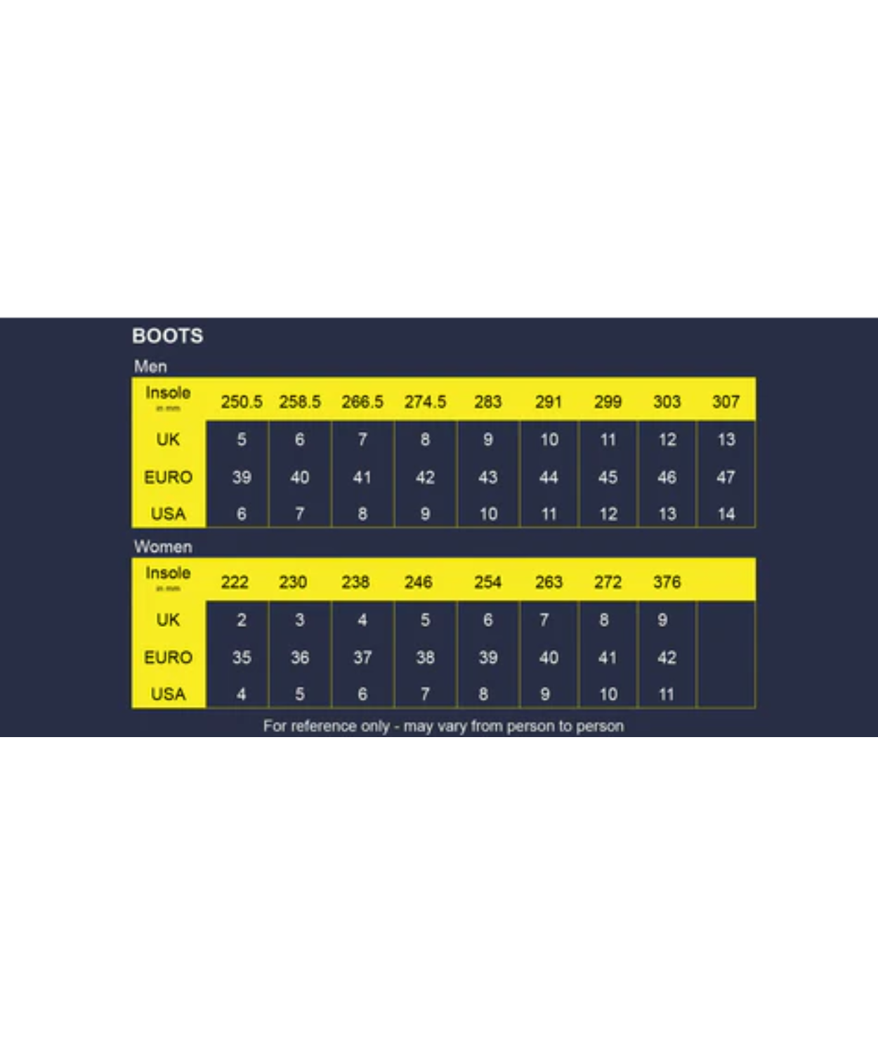 | Insole(In mm) | 250.5 | 258.5 | 266.5 | 274.5 | 283 | 291 | 299 | 303 | 307 |