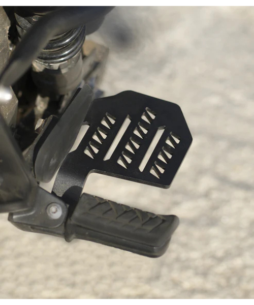 This gives a good comfort to the pillions foot and gives ample space to rest it during those long rides, also it gives protection from the heat burns towards the exhaust side.