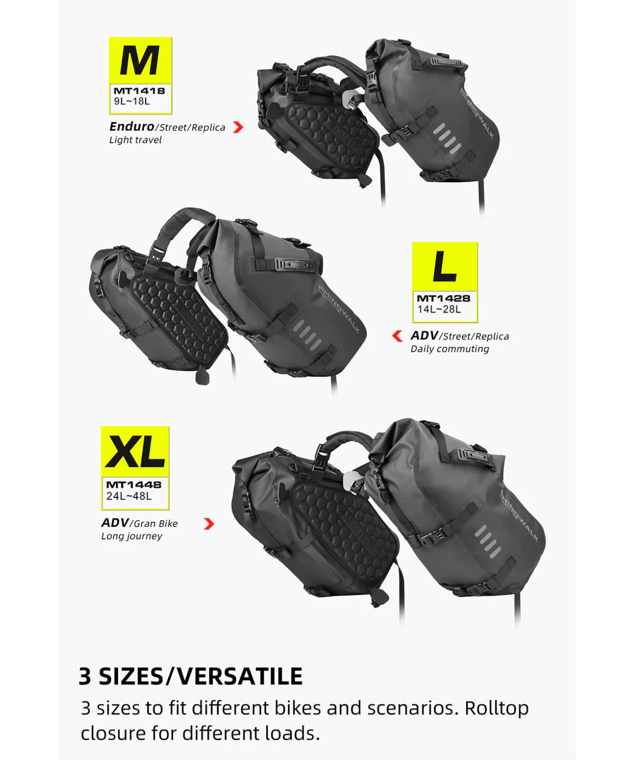 - Simply fold the bag down 3-4 times, buckle, and you are ready for adventure Our waterproof motorcycle saddle bag is soft sided and completely collapsible to make storage easy.