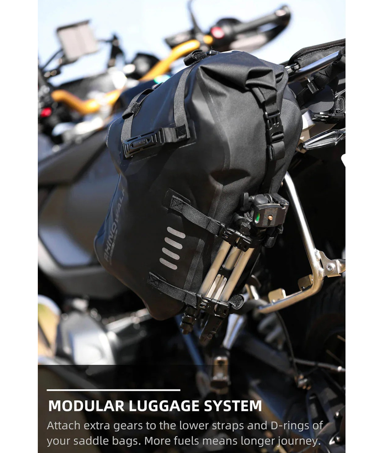 - The motorcycle saddle bag is made of 500D PVC tarpaulin material, which is 100% waterproof and the most stand wear and tear motorcycle material.