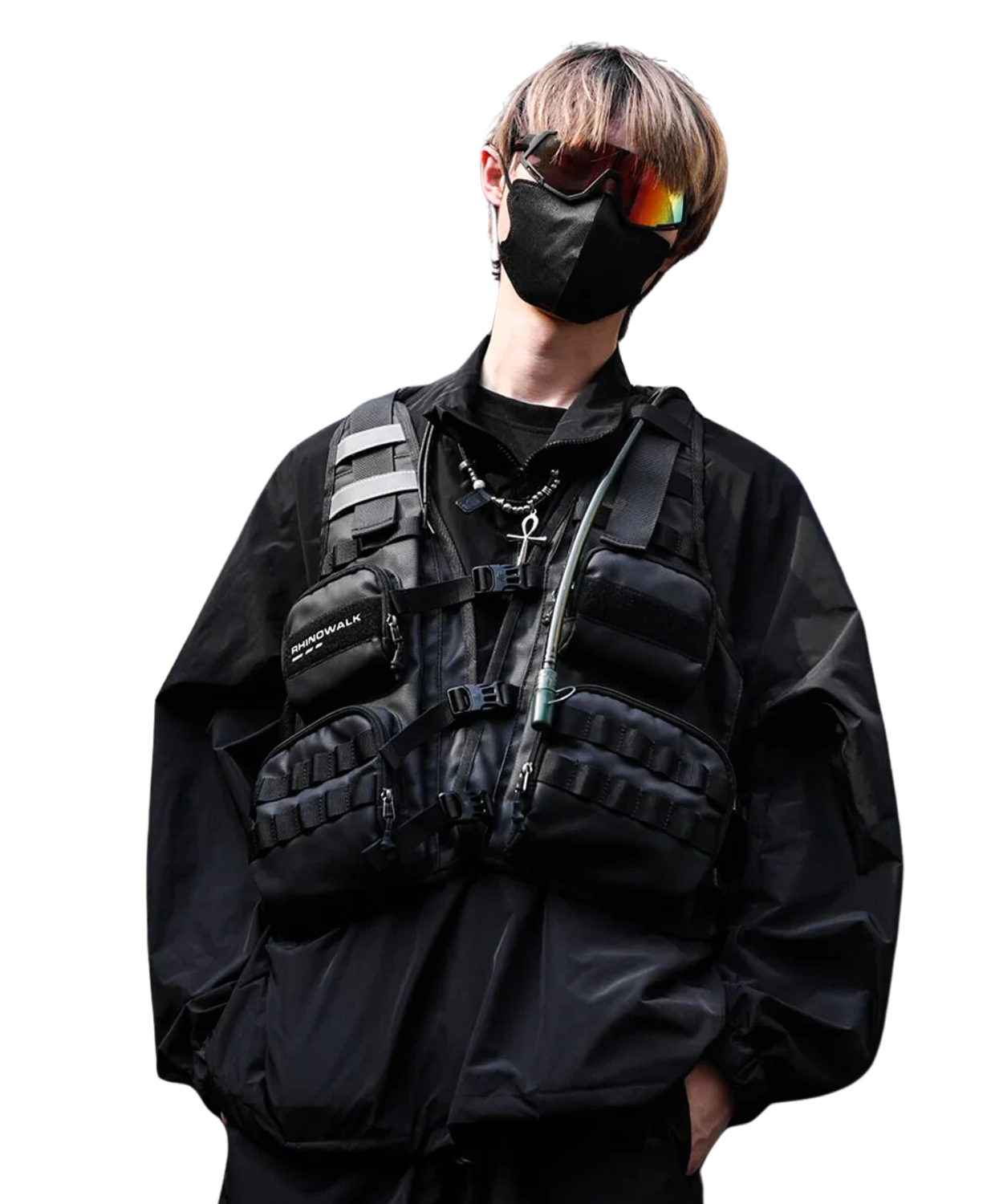 - Hydration system: Back pocket holds 2 hydration bladder. Front webbing fix the tubem, prevent shaking, easy to drink water.