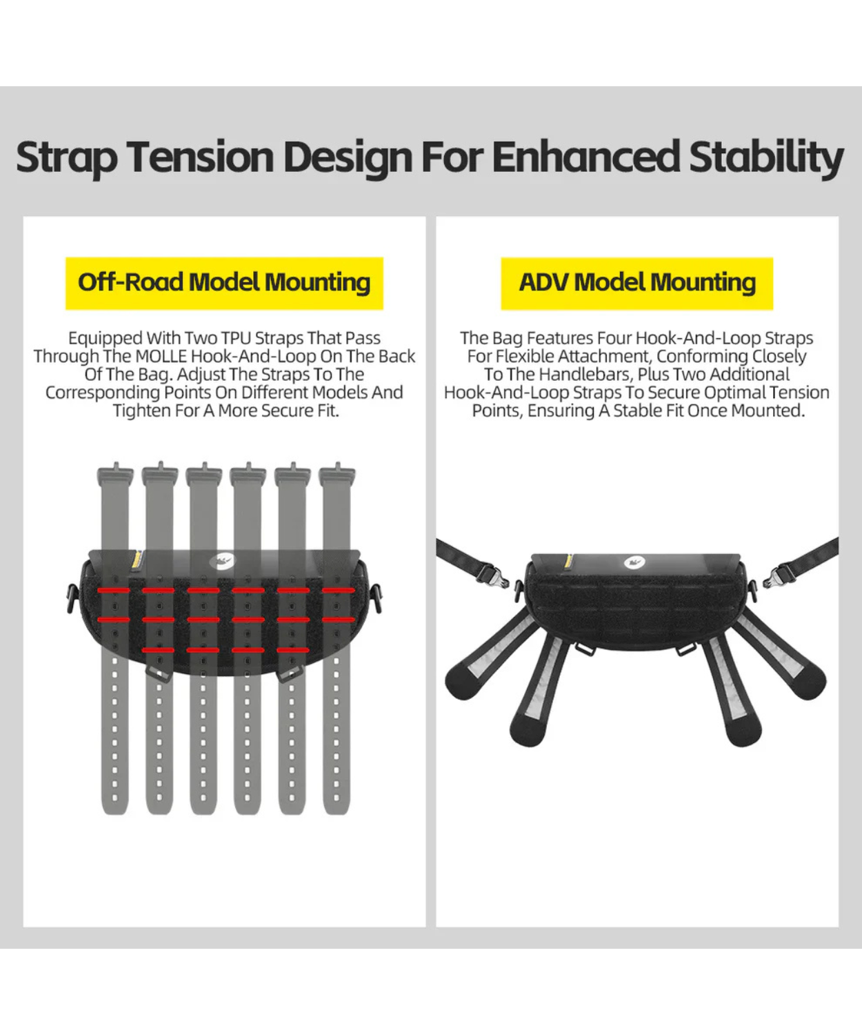 - Engineered for adventure and off-road motorcycles, this bag integrates seamlessly with standard handlebar setups.