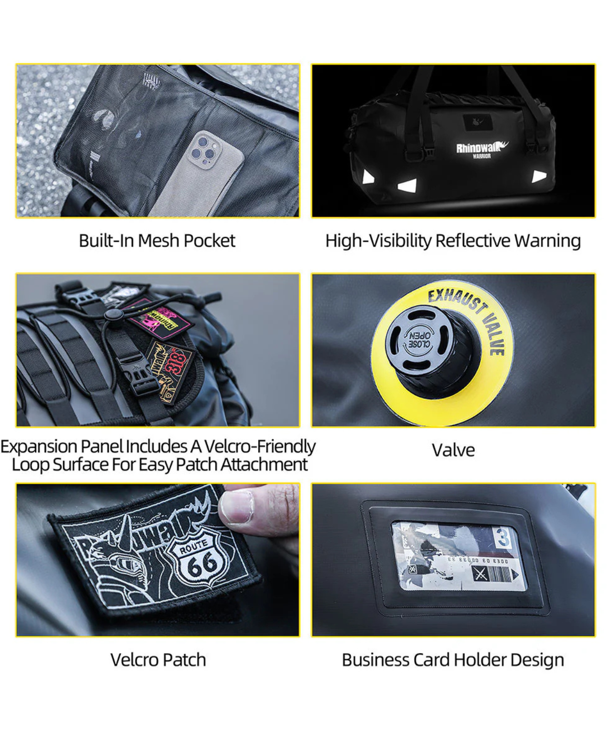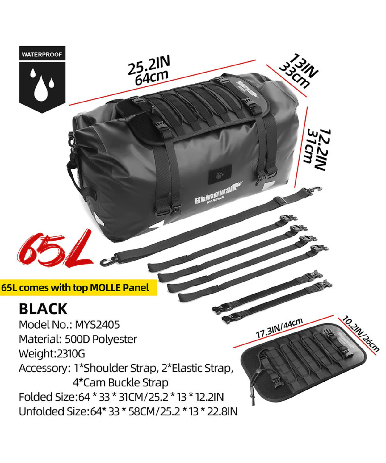 - Designed for serious riders, the Rhinowalk Waterproof Motorcycle Roll-Top Duffel offers 65 liters of rugged storage capacity.