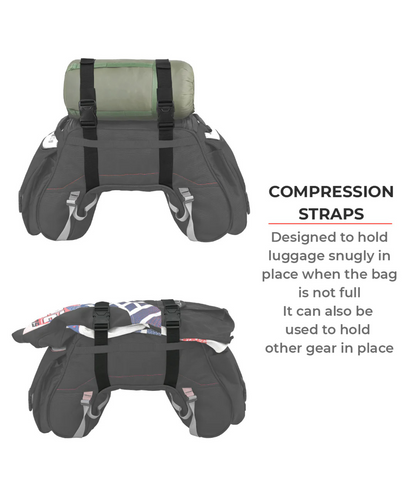 With a 48L capacity, this universal luggage system carries enough for a 5-7 trip and works on almost all motorcycles. Using the MOLLE loop system and compression straps, you can choose to add on a 2/3 person camping tent, a sleeping bag or the POD 12L/ POD 22L expanders to better organize & separate out your stuff. The bag comes with an external rain cover and a detachable shoulder belt.