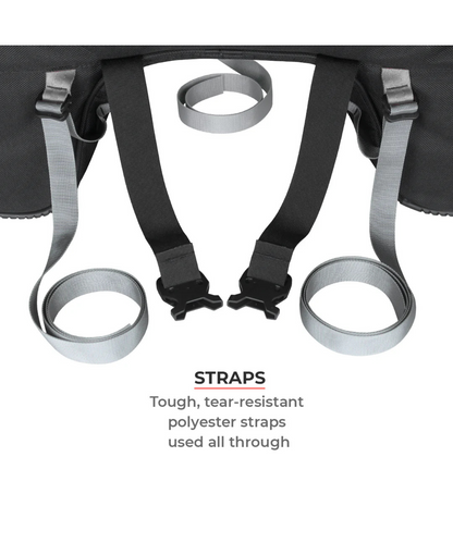 - Tough, tear-resistant polyester webbing used all through