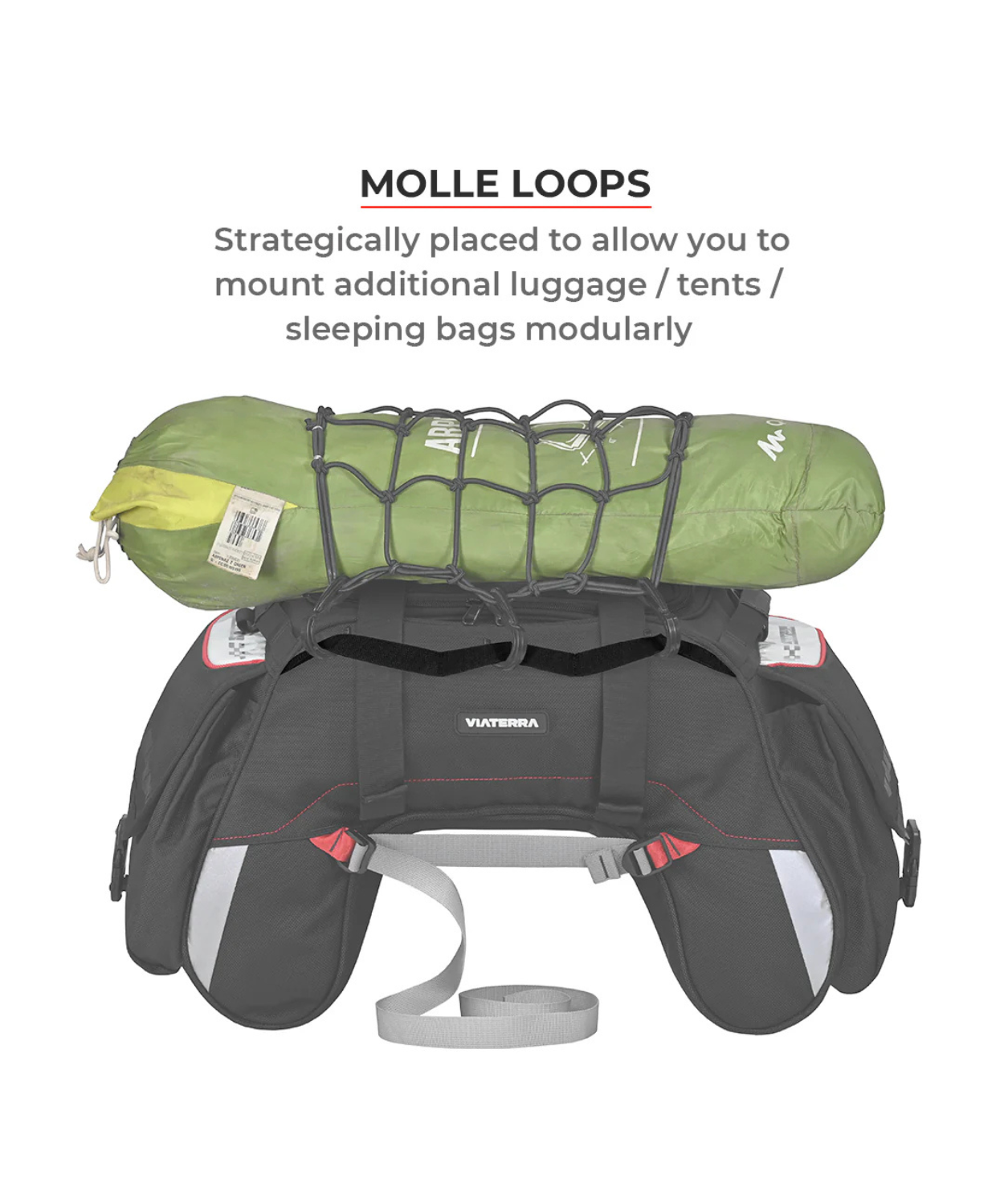 Suitable for 2-3 week long trip and you can mount additional luggage/ tents/ sleeping bags etc using the MOLLE LOOP system.