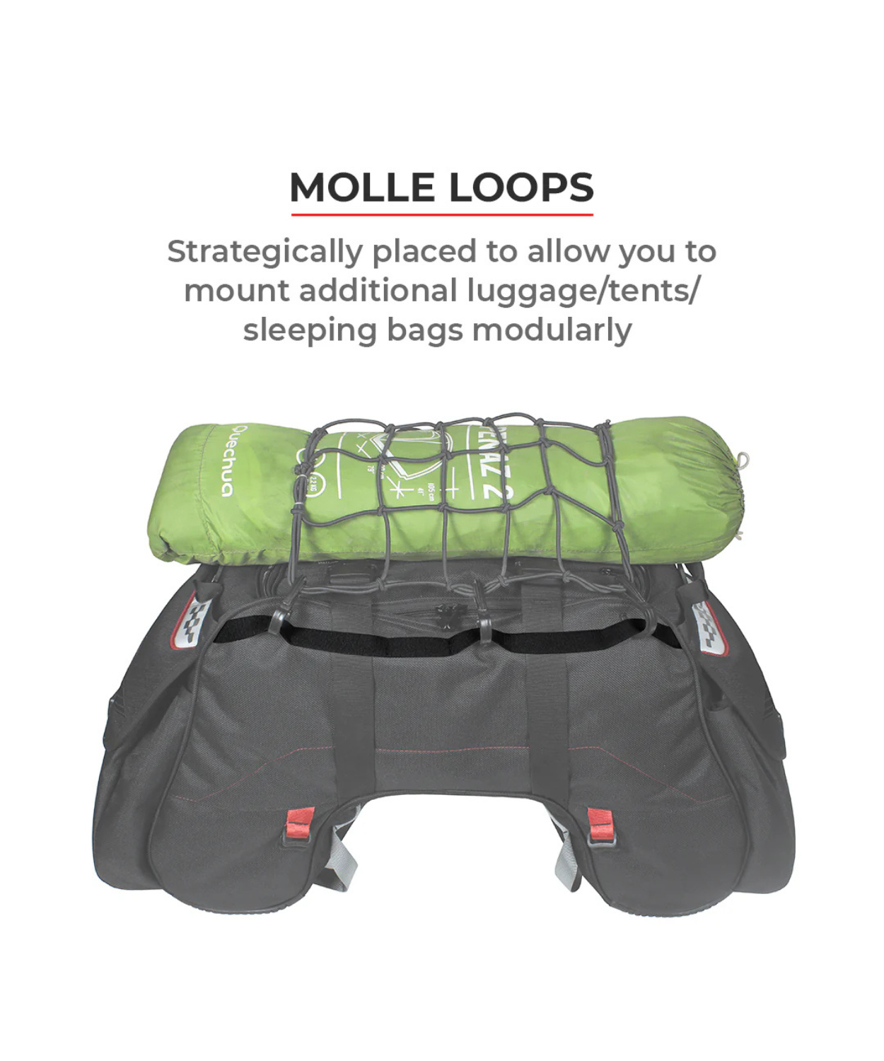 Suitable for 2-3 week long trip and you can mount additional luggage/ tents/ sleeping bags etc using the MOLLE LOOP system.