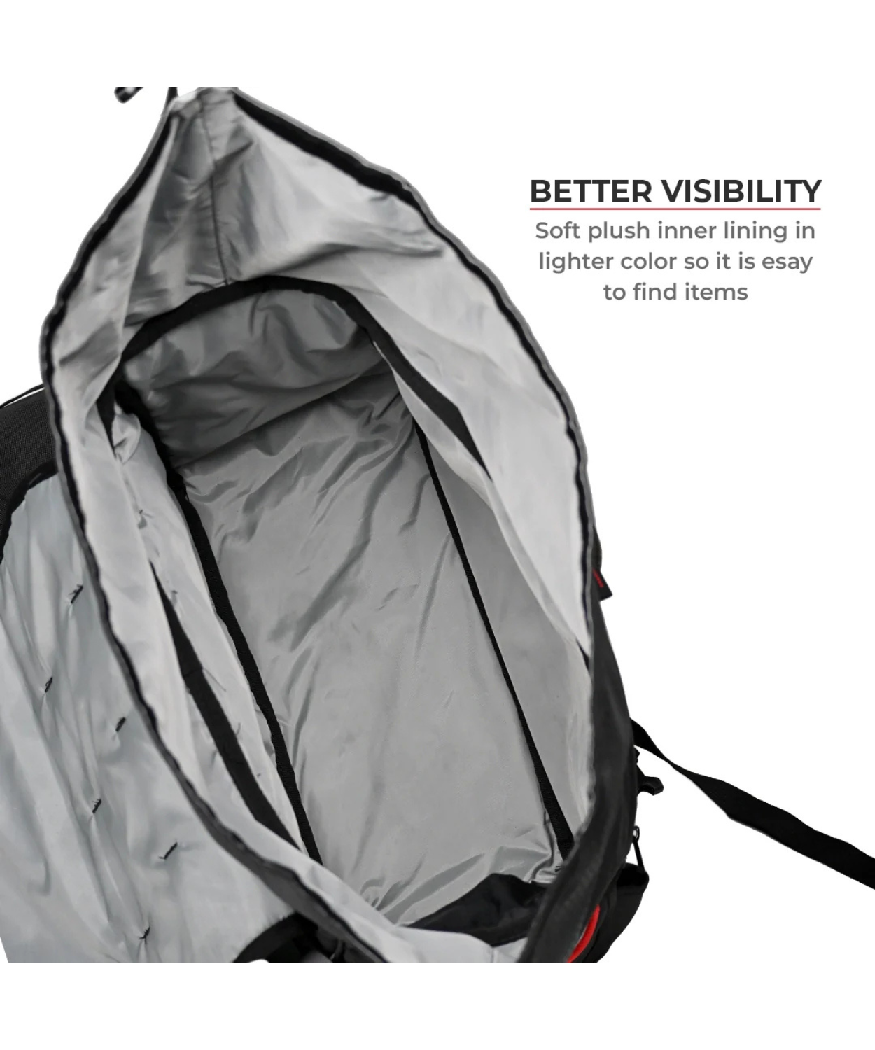 - The top opening is rolled down and secured with a strap buckle closure to secure it in place. Effective luggage distribution
