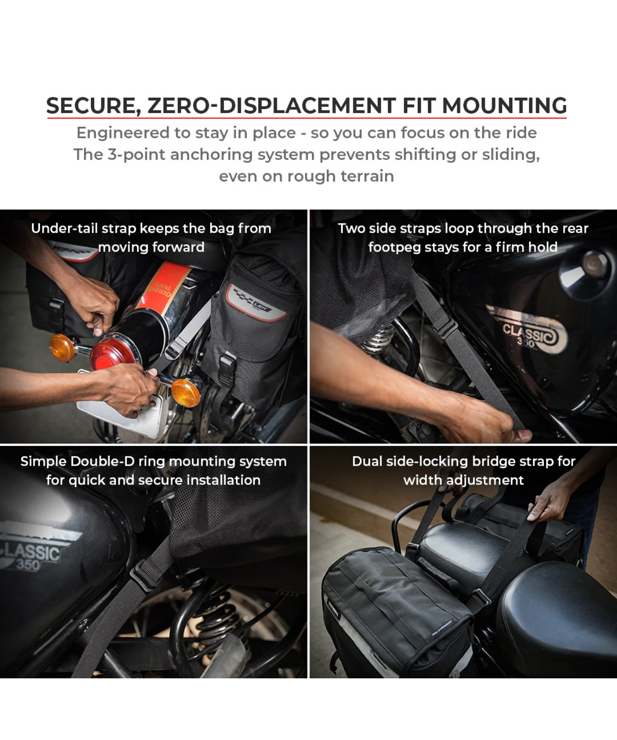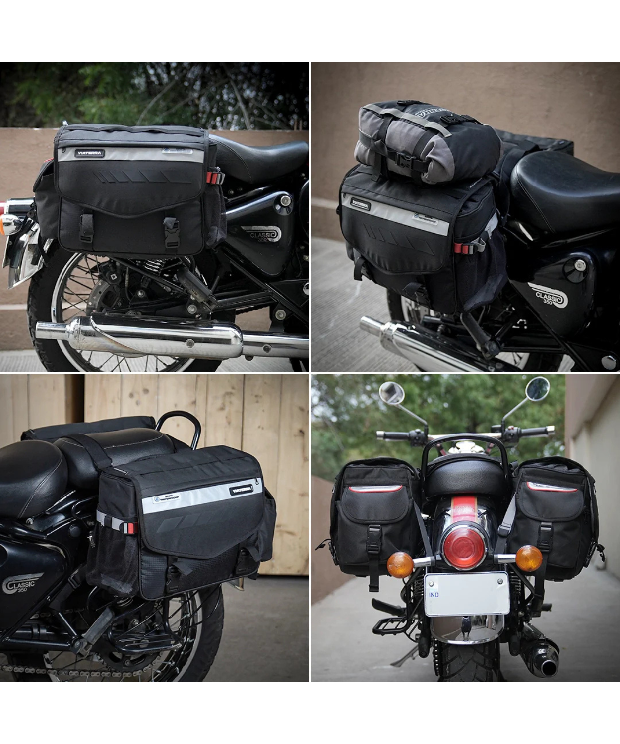 - Built for motorcyclists who need a compact yet rugged luggage solution, the Leh Mini WP saddlebags offer the same 100% waterproof performance as their full-size counterpart, now in a more versatile, travel-friendly form. Designed to fit a wide range of motorcycles, especially those with straight exhausts like Royal Enfields and Triumph Bonnevilles these bags also work seamlessly with up-swept exhausts when paired with a saddle rack for safe clearance.