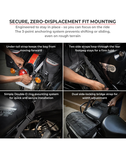 Two straps loop through the rear footpeg stays (to secure the bag in place)