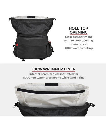 - Main compartment with ROLL TOP opening to enhance 100% waterproofing while making it easy to compress any extra volume.