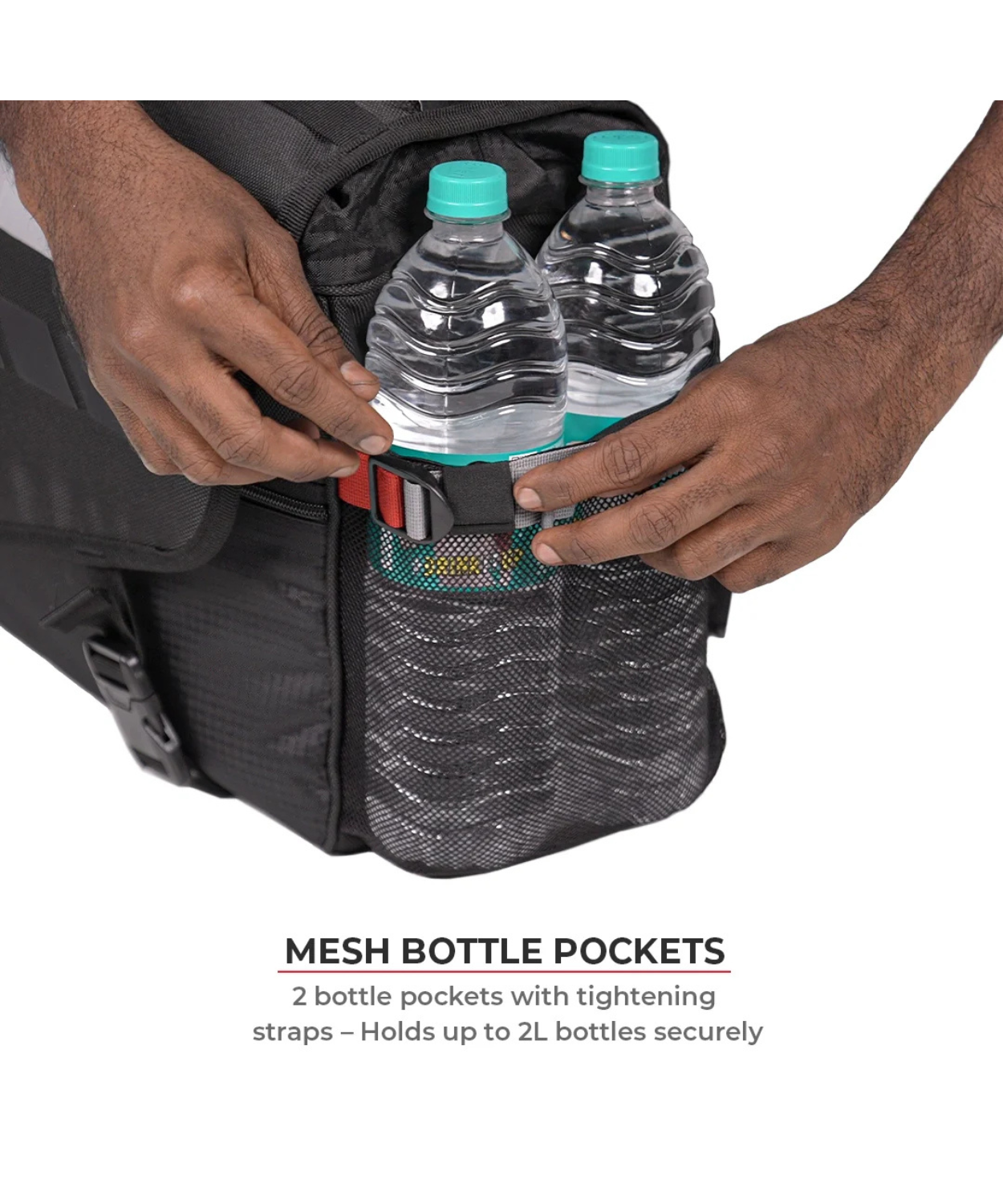 - 2 outside bottle pockets with tightening straps – can carry a 2 liter bottle