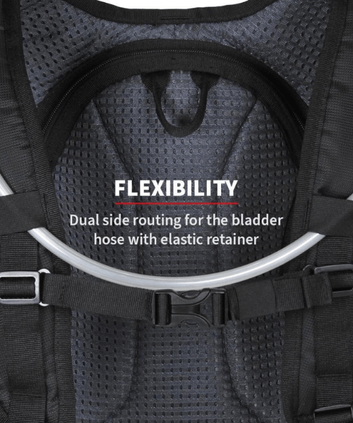 - Dual side routing for the bladder hose with elastic retainer