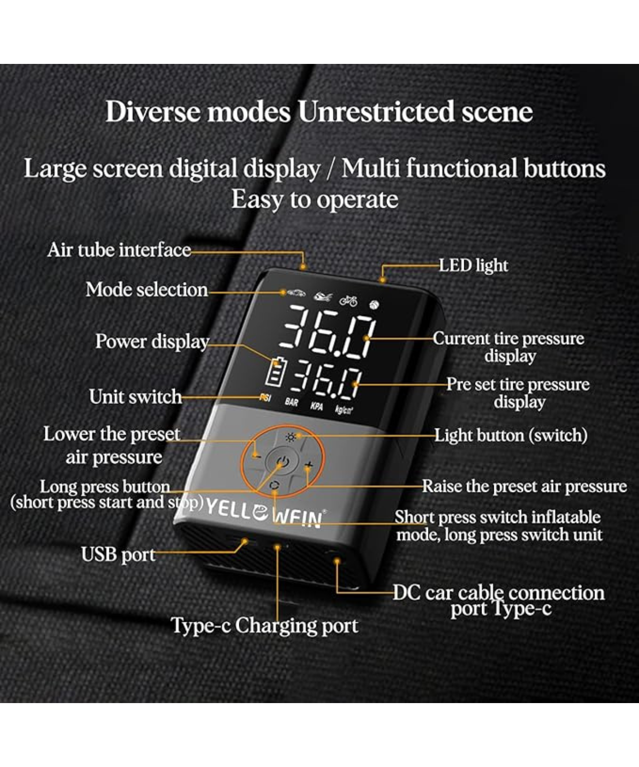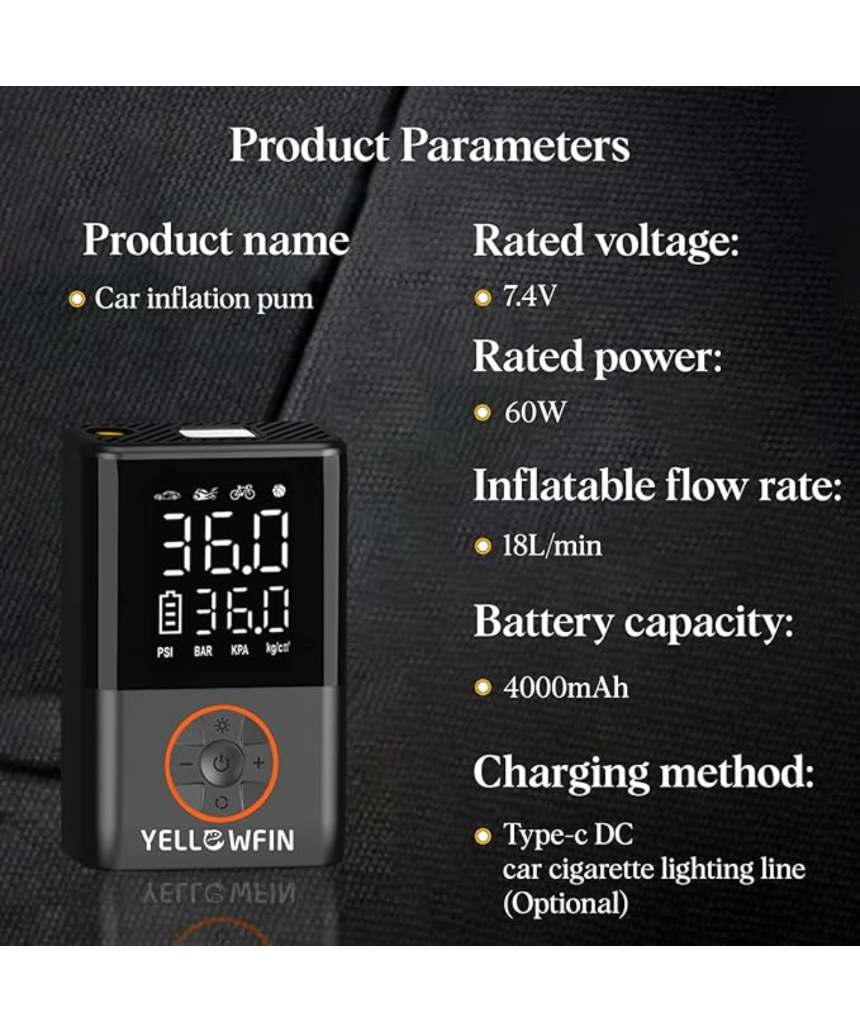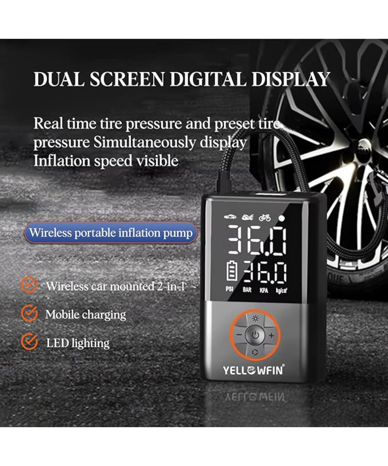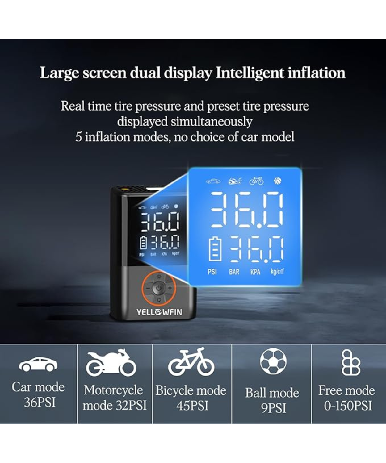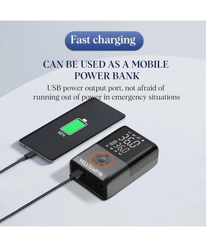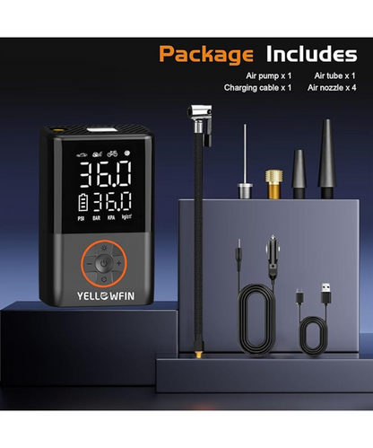 Product Description: Yellowfin Tyre Inflator 150 PSI | 4000 mAh Battery Digital Display Auto Shut-Off LED Flashlight Preset Modes Fast Air Pump Compressor for Car, Bike, Cycle, Ball, Type-C Rechargeable, Cordless.