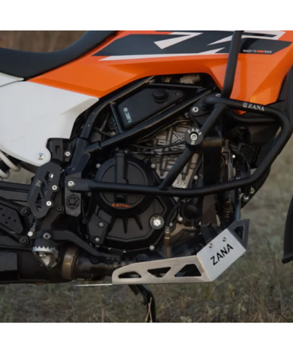 Take your crash protection up a notch with Zana’s aluminum sump guard, offering additional safety for the lower engine. The crash bars are built with ample clearance around the KTM’s fairing and engine to absorb and distribute impact effectively at low speeds.